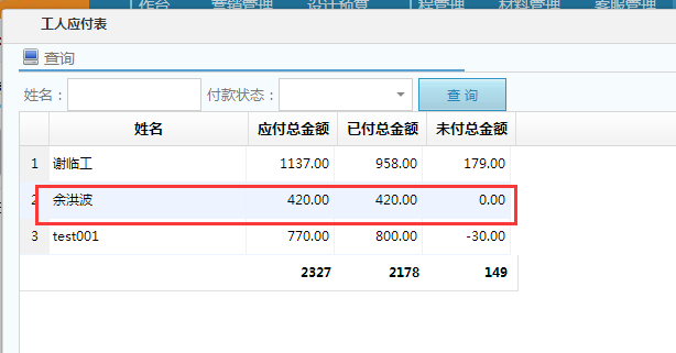 6、財(cái)務(wù)付款及報(bào)表項(xiàng)目經(jīng)理審核過的單據(jù)就會(huì)流轉(zhuǎn)到財(cái)務(wù)部門進(jìn)行過賬,在財(cái)務(wù)管理-工程領(lǐng)款單中,選擇對(duì)應(yīng)單據(jù),輸入實(shí)付金額、付款賬戶點(diǎn)擊通過即付款完成。完成付款的工人可在“工人應(yīng)付報(bào)表”可查看付款情況。 如下圖所示: