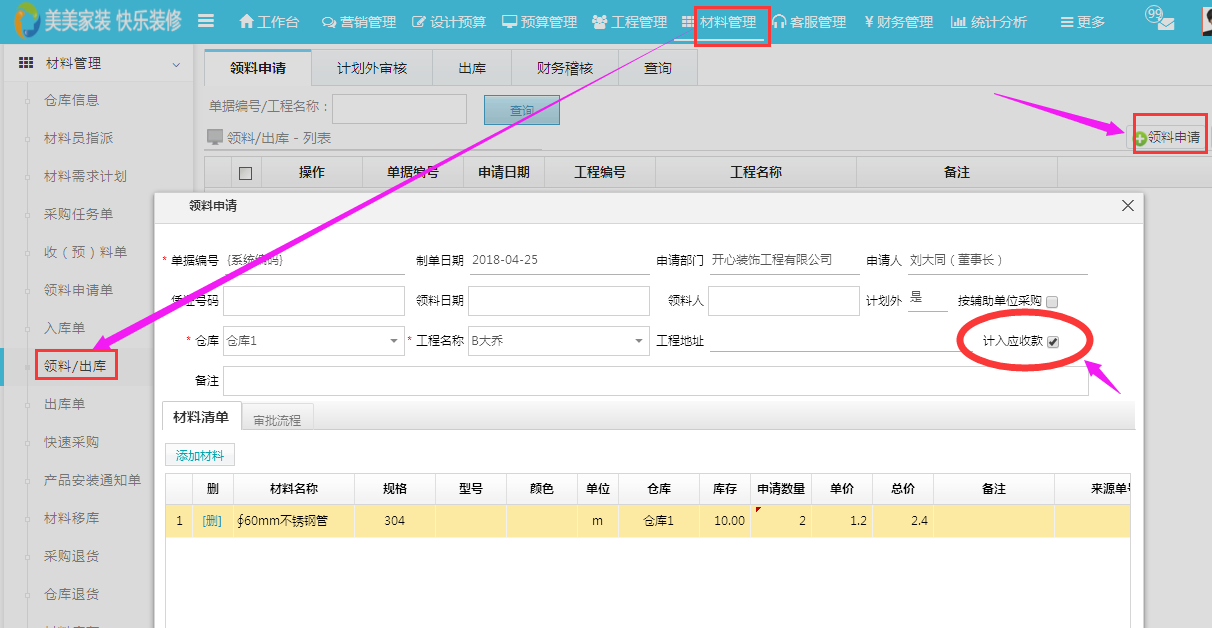 我們?cè)谧鲱I(lǐng)料/出庫單的時(shí)候如果此材料是臨時(shí)采購并需要計(jì)入客戶收款中時(shí)請(qǐng)注意勾選“計(jì)入應(yīng)收款”