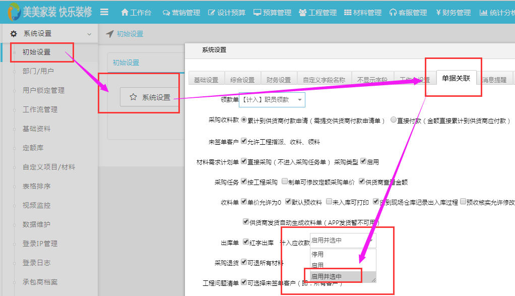 依次點(diǎn)擊:**系統(tǒng)設(shè)置---初始設(shè)置---系統(tǒng)設(shè)置---單據(jù)關(guān)聯(lián)**
