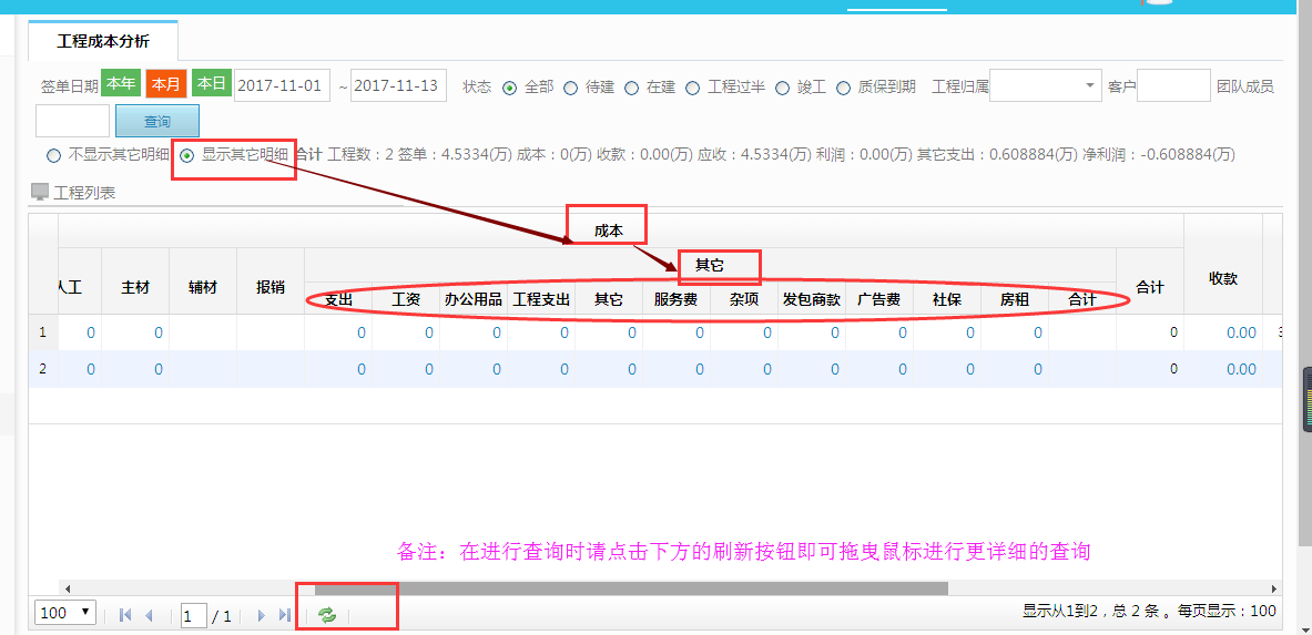 1、打開(kāi)【統(tǒng)計(jì)分析】--【工程成本分析】顯示為不顯示其他明細(xì)
