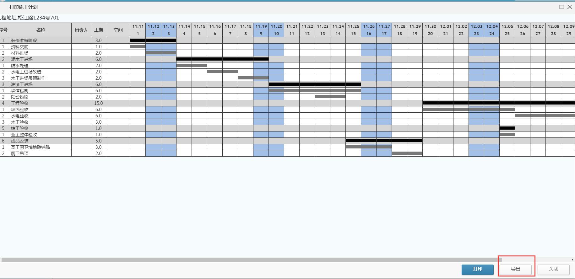 ,裝修平臺在之前打印施工進度計劃的功能之上新增:施工計劃導出到excel表格。該功能的上線,有利于工程部調整施工計劃打印及本地存檔。