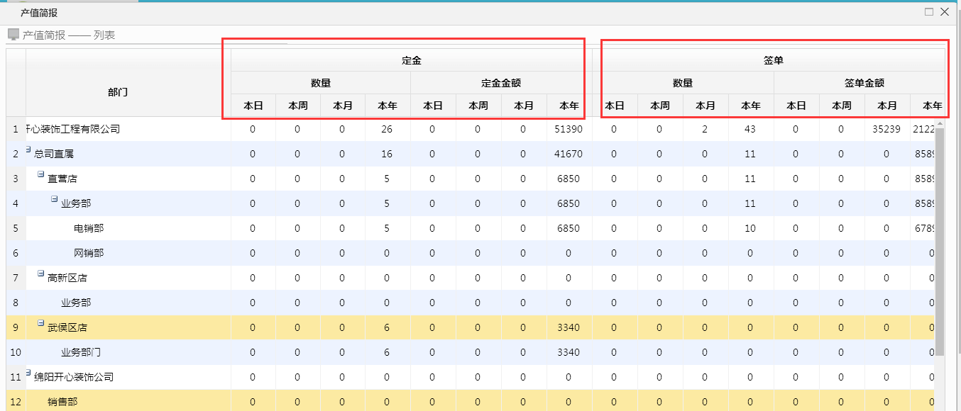 2:在此簡(jiǎn)報(bào)中可直觀的查詢各部門(mén)業(yè)務(wù)員在各個(gè)時(shí)間段簽約客戶的定金和簽單匯總數(shù)量和總金額