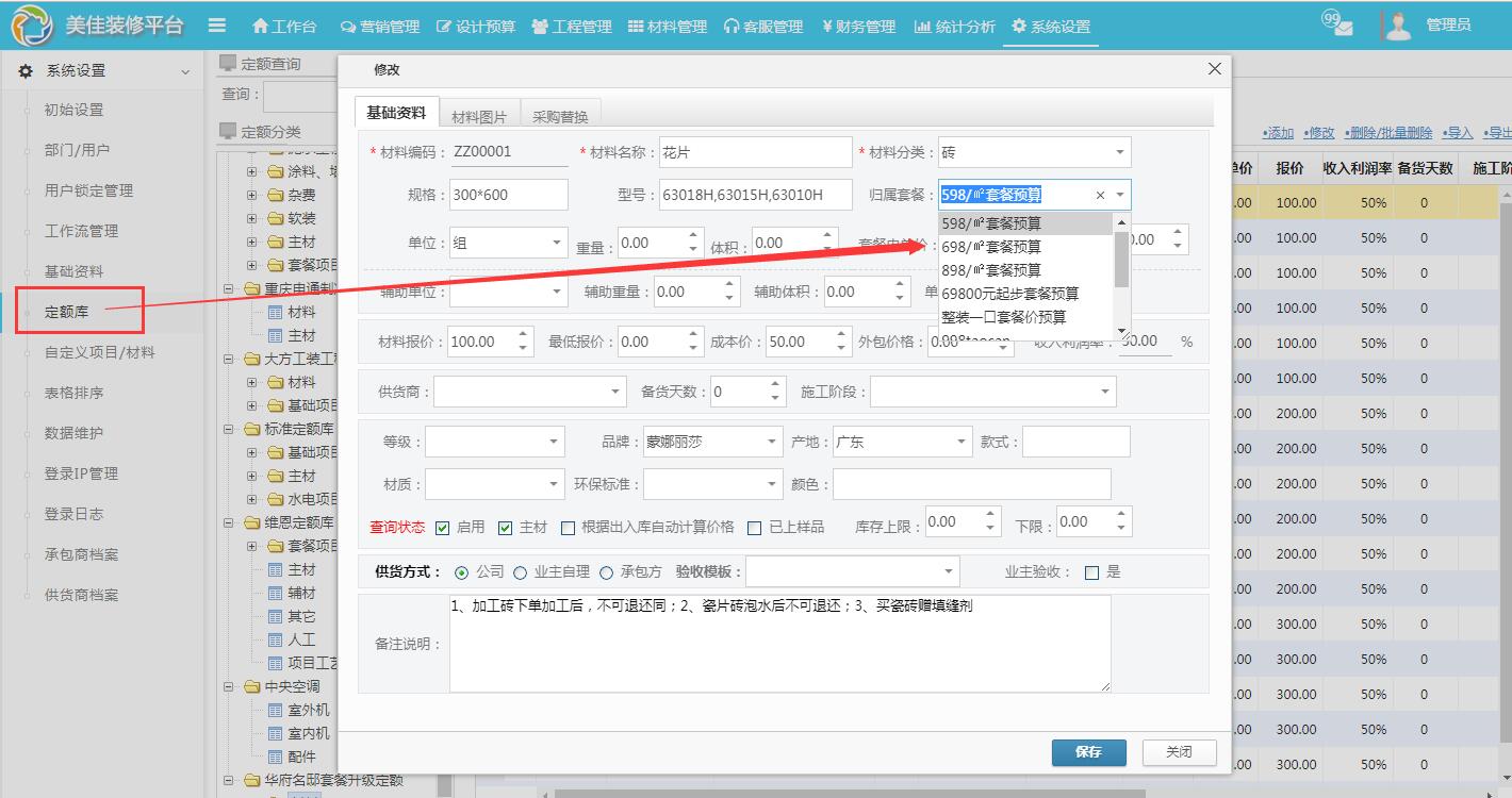 3、制作預(yù)算,套餐預(yù)算材料升級(jí)時(shí)從定額庫(kù)選擇須要升級(jí)到哪個(gè)套系材料,圖示: