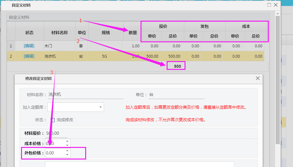 3、修改材料中增加外包價(jià)格;
