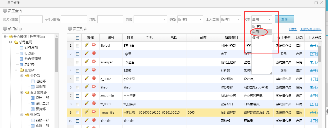 1、系統(tǒng)設(shè)置--部門/用戶--員工管理(選中相關(guān)職員修改狀態(tài),取消啟用功能)