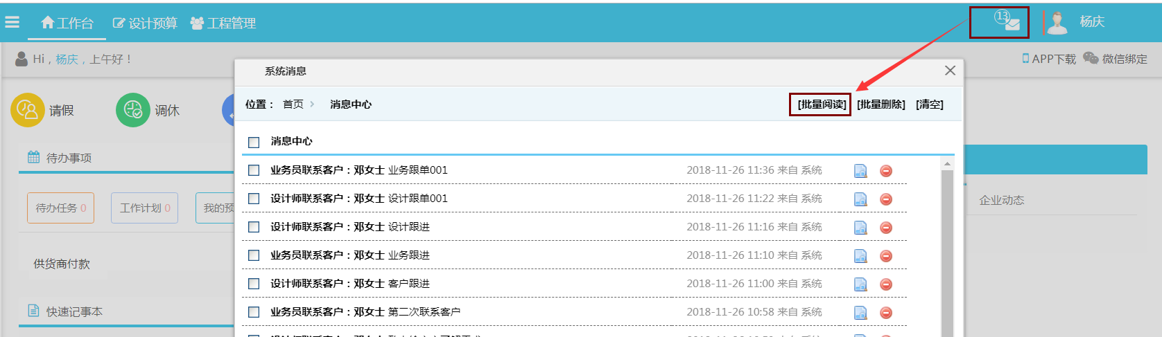 2、消息中心可查看有史以來所有的工作提醒消息,所有內(nèi)容一目了然,快速查漏自己未完成的工作。同時新增批量閱讀的功能,已閱讀的信息便可進(jìn)行勾選,使之從未閱讀數(shù)量中自動過濾