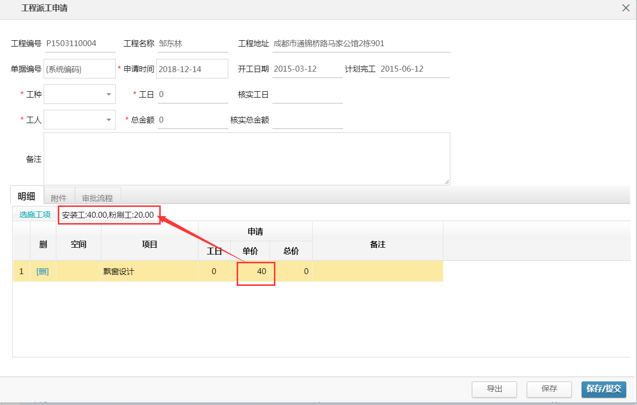 如果工程派工時(shí)直接選擇施工項(xiàng),則以施工項(xiàng)中已設(shè)置的工種報(bào)價(jià)為準(zhǔn),如果此項(xiàng)目中包含多個(gè)工種,則以第一個(gè)工種報(bào)價(jià)為準(zhǔn)。如下所示