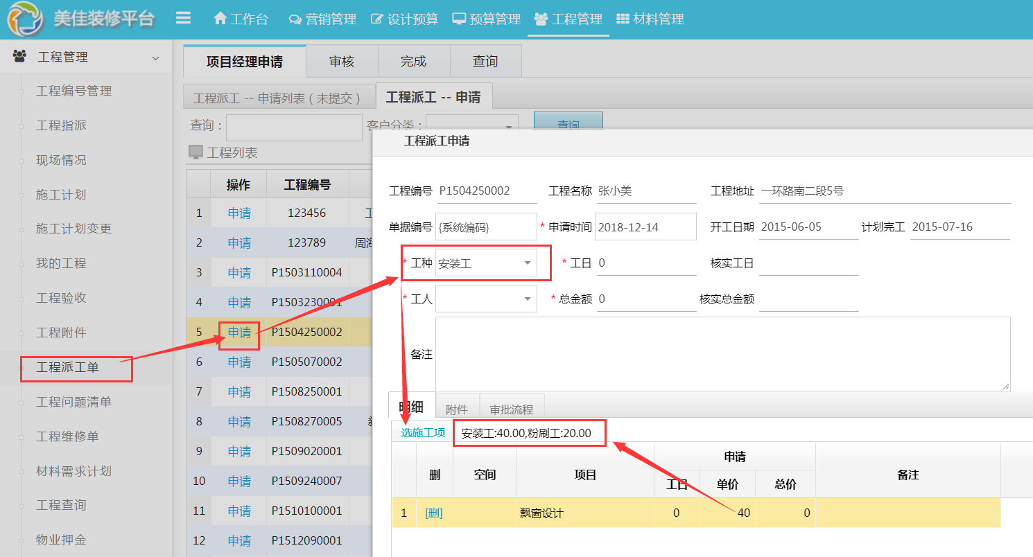 依次點(diǎn)擊:工程管理---工程派工單---申請(qǐng)