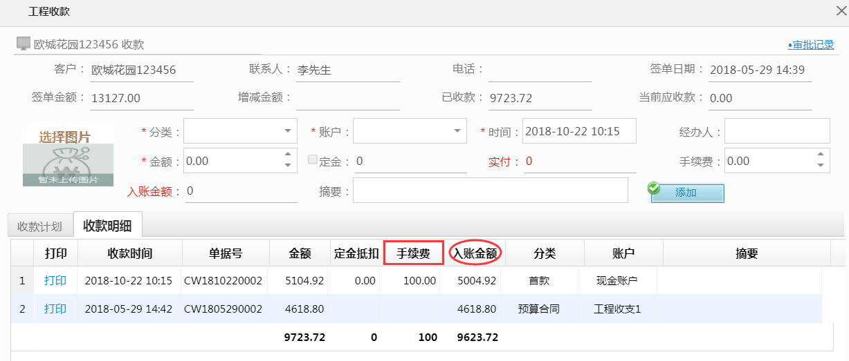 資金回籠是一個(gè)公司的首重之重,對于收款的各個(gè)名目管理也是讓人抓破頭皮,管理明細(xì)賬的冗雜也是讓人很無力,近期美佳技術(shù)人員在搜集各位客戶的需求時(shí)針對這一現(xiàn)象優(yōu)化了工程收款相關(guān)明細(xì)。在收款界面新增手續(xù)費(fèi),扣除手續(xù)費(fèi)后直接生成入賬金額。具體操作如下所示:
