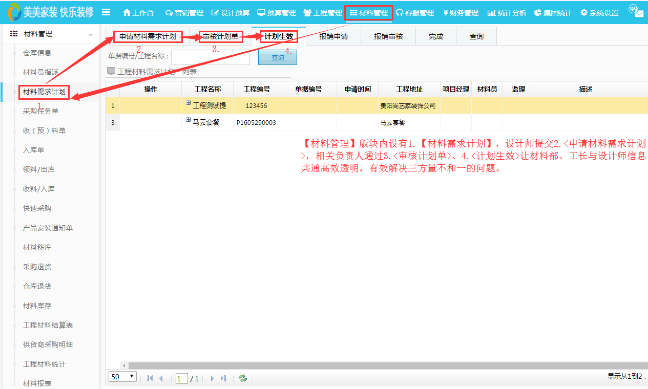 美佳云裝系統(tǒng)優(yōu)化了對(duì)材料的管控,部門(mén)與部門(mén)之間實(shí)現(xiàn)精準(zhǔn)高效的信息互通,保證了項(xiàng)目順暢無(wú)誤的進(jìn)行。從源頭上保證了客戶(hù)的滿(mǎn)意度。設(shè)計(jì)師先提交<申請(qǐng)材料計(jì)劃>,相關(guān)負(fù)責(zé)人通過(guò)<審核計(jì)劃單>之后,<計(jì)劃生效>信息共通,保證預(yù)算量、結(jié)算量和開(kāi)單量的三量合一。整個(gè)流程在系統(tǒng)內(nèi)就可以精確的溝通傳達(dá)并完成,大大的提高了工作效率,縮短了復(fù)雜的申報(bào)過(guò)程,審核時(shí)間。