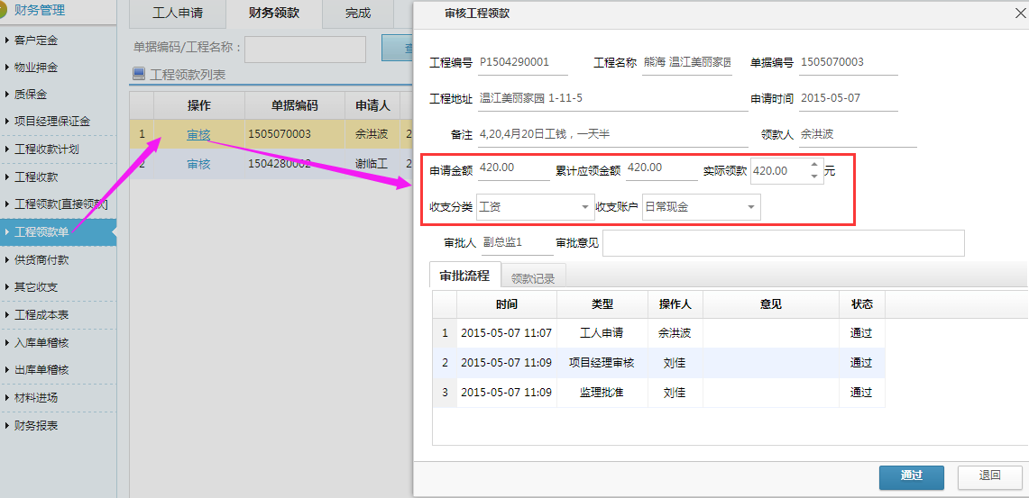 6、財(cái)務(wù)付款及報(bào)表項(xiàng)目經(jīng)理審核過的單據(jù)就會(huì)流轉(zhuǎn)到財(cái)務(wù)部門進(jìn)行過賬,在財(cái)務(wù)管理-工程領(lǐng)款單中,選擇對(duì)應(yīng)單據(jù),輸入實(shí)付金額、付款賬戶點(diǎn)擊通過即付款完成。完成付款的工人可在“工人應(yīng)付報(bào)表”可查看付款情況。 如下圖所示: