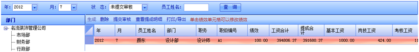 生成工資前要為員工選擇職級,否則無法為該員工生成工資,員工工資可按月批量生成。員工工資生成后將狀態(tài)選擇為未提交審核,便可查看該員工的工資情況,此時(shí)可以修改員工的績效,績效修改后,績效工資和工資合計(jì)會發(fā)生相應(yīng)的變化。若確定無誤后就可以提交審核,提交審核也可以批量操作。