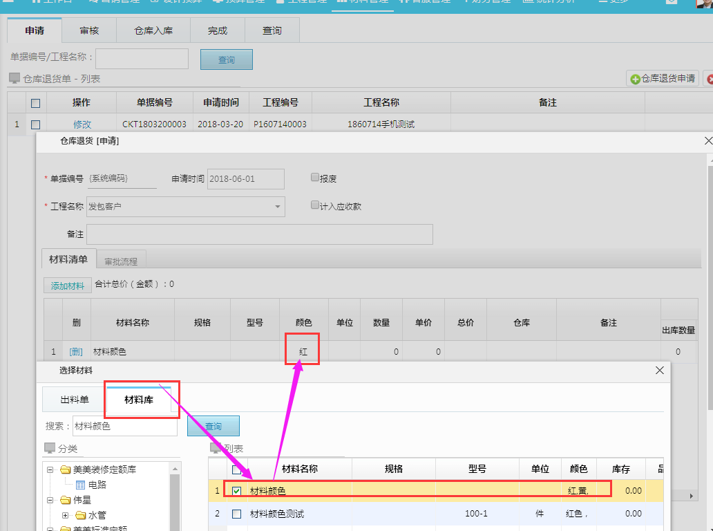 1:選中出庫單中材料:默認(rèn)材料顏色為制作領(lǐng)料/出庫單申請時(shí)選中的材料顏色;